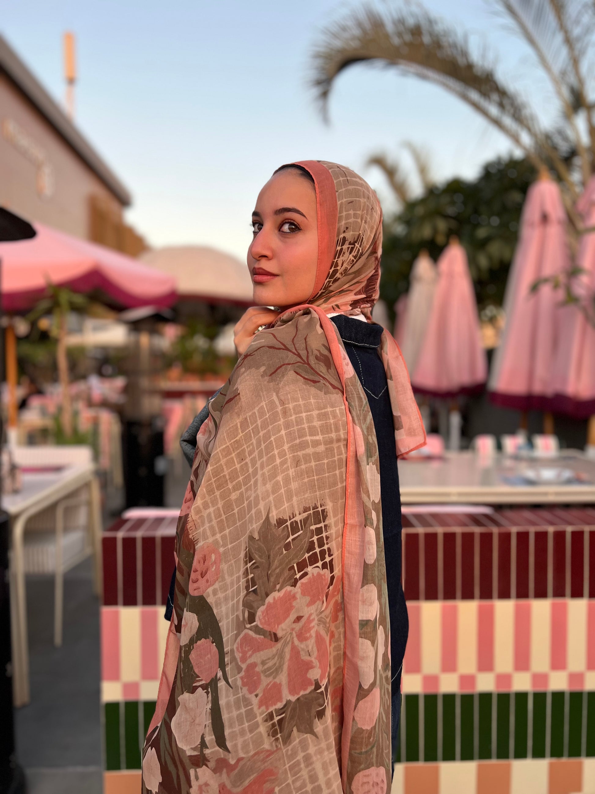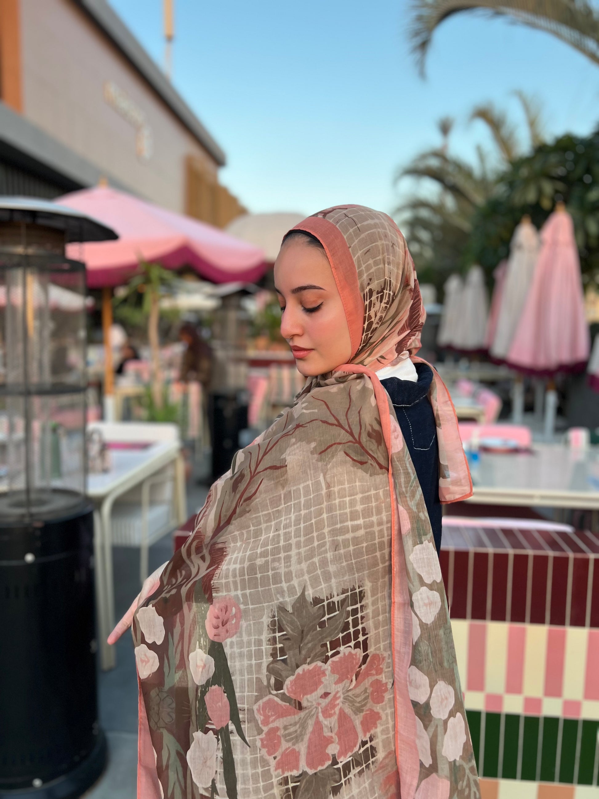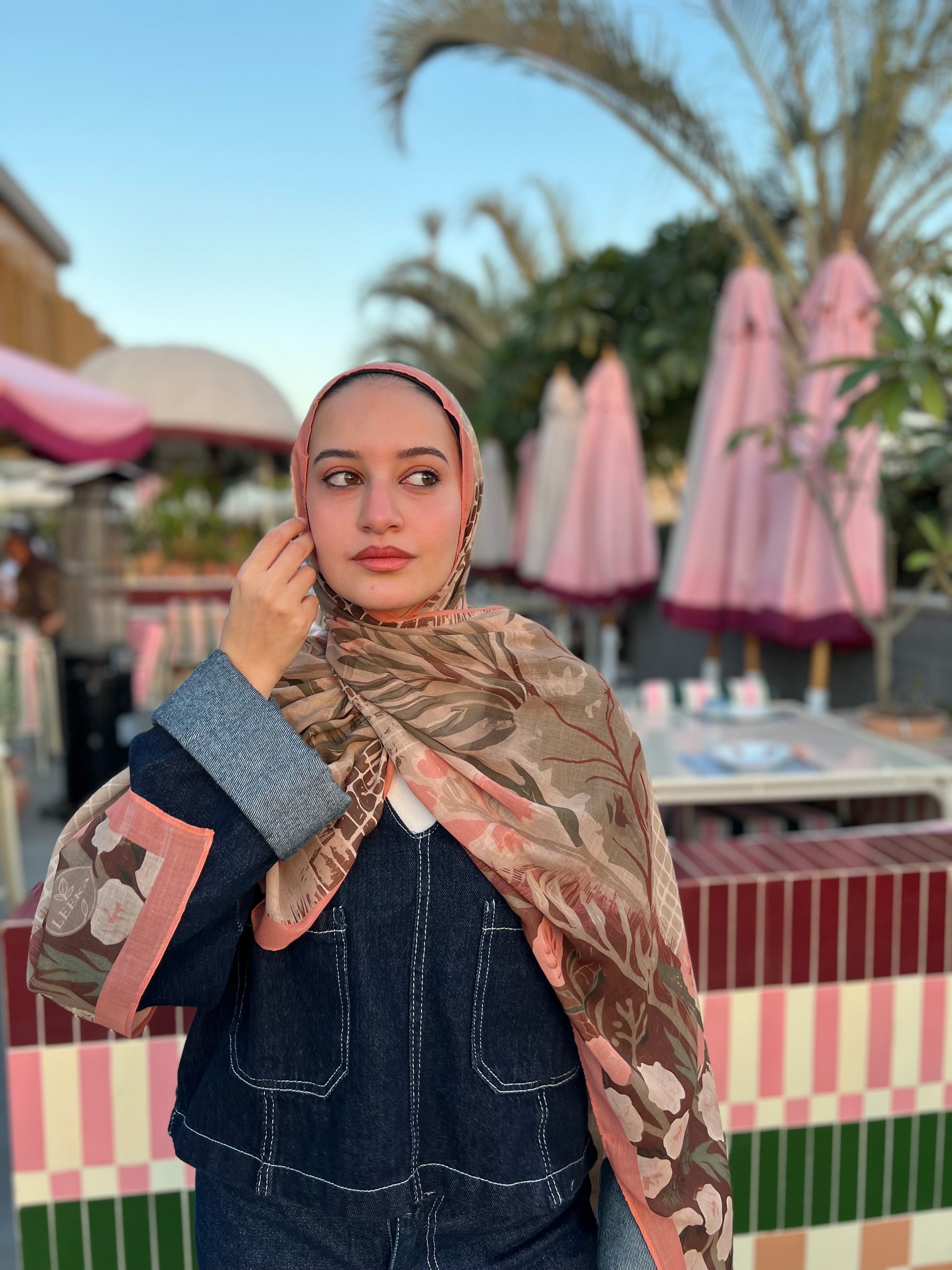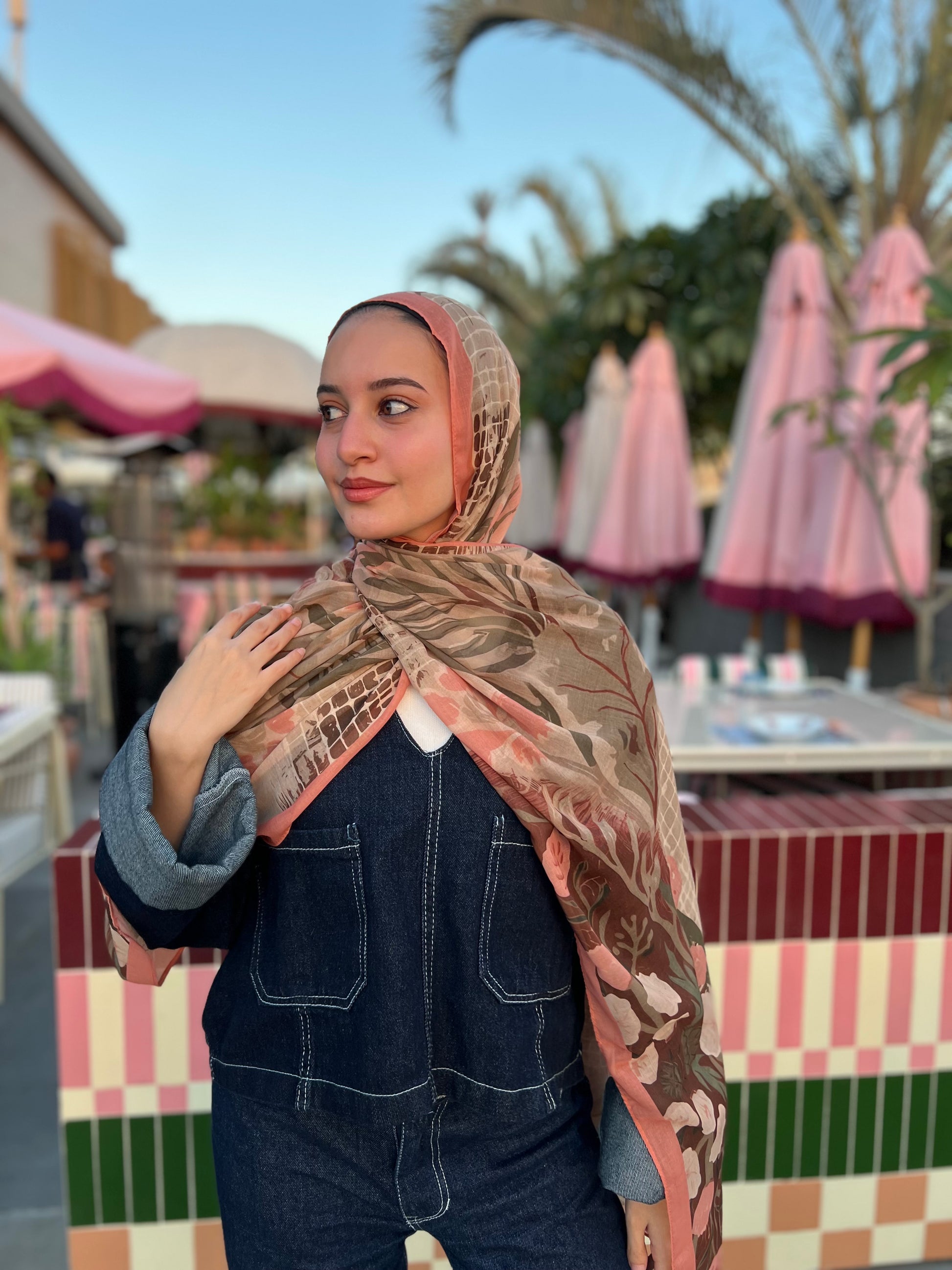 Soft voile scarf inspired by the beauty of nature in full bloom. Featuring earthy tones that brings a warm, feminine charm to any outfit. Light yet structured, it drapes gracefully while maintaining a refined feel.